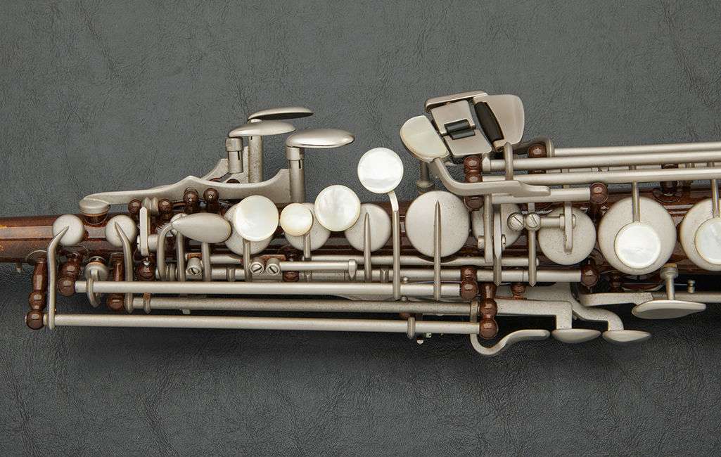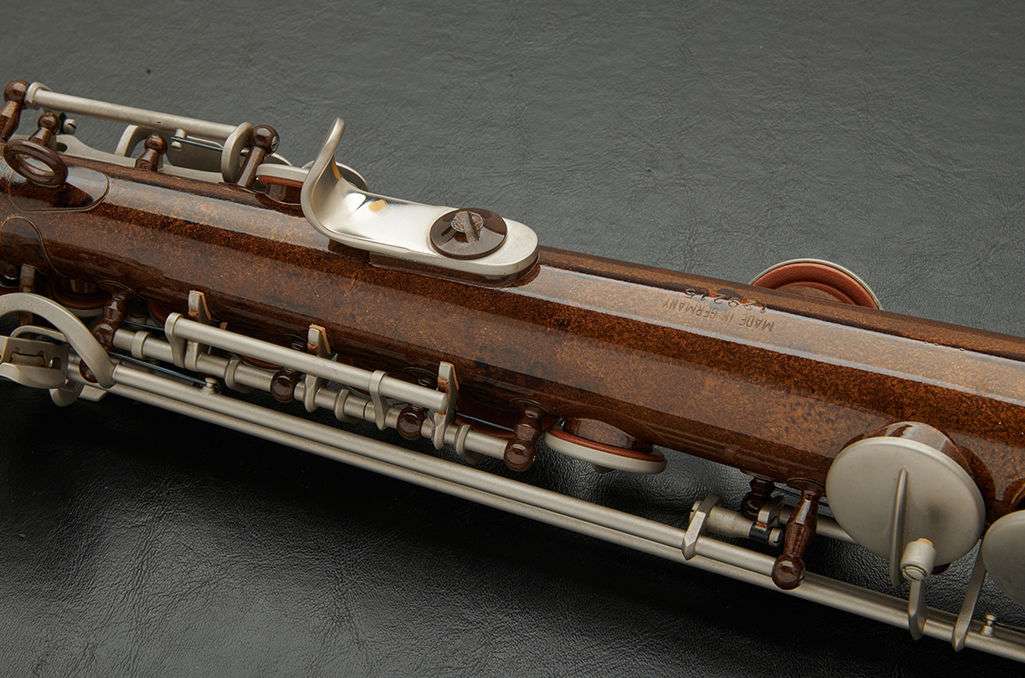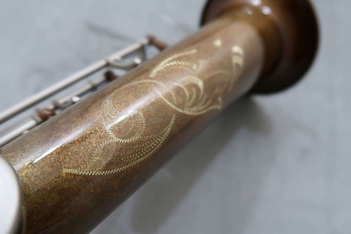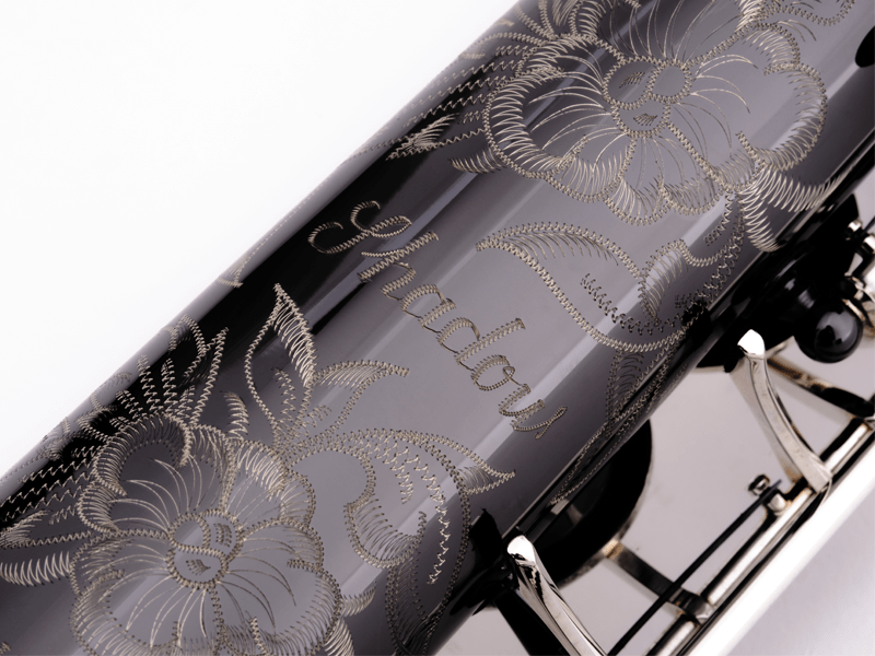 The black nickel-plated body and silver-plated keys, along with extensive hand engraving give this instrument its distinctive look.
