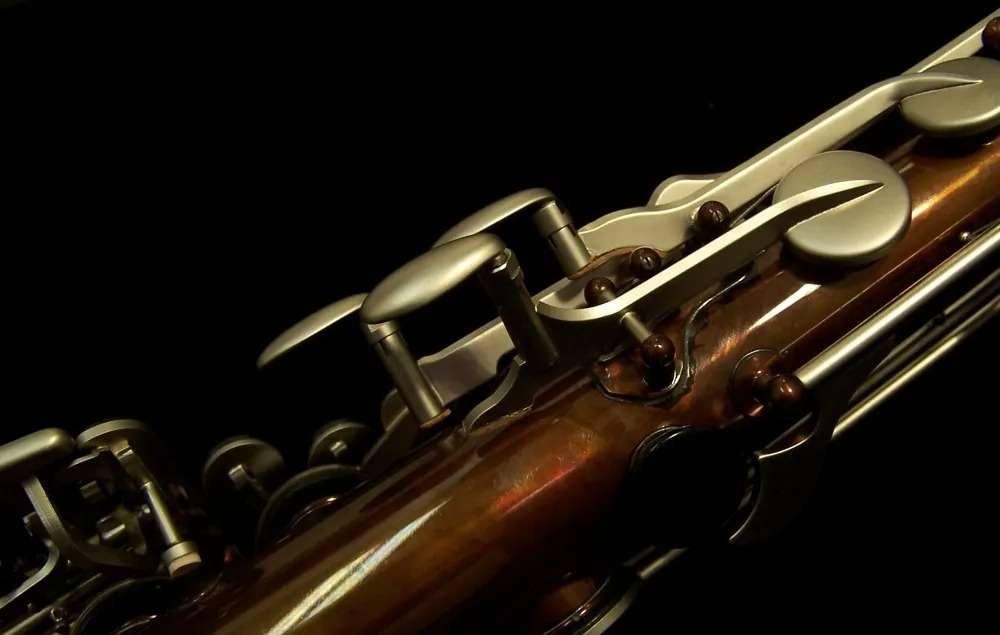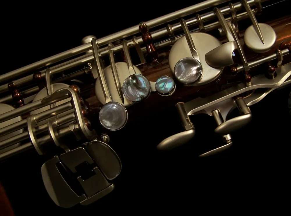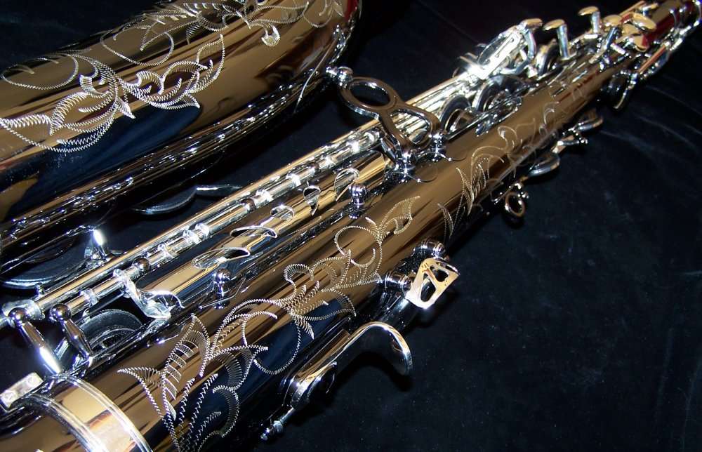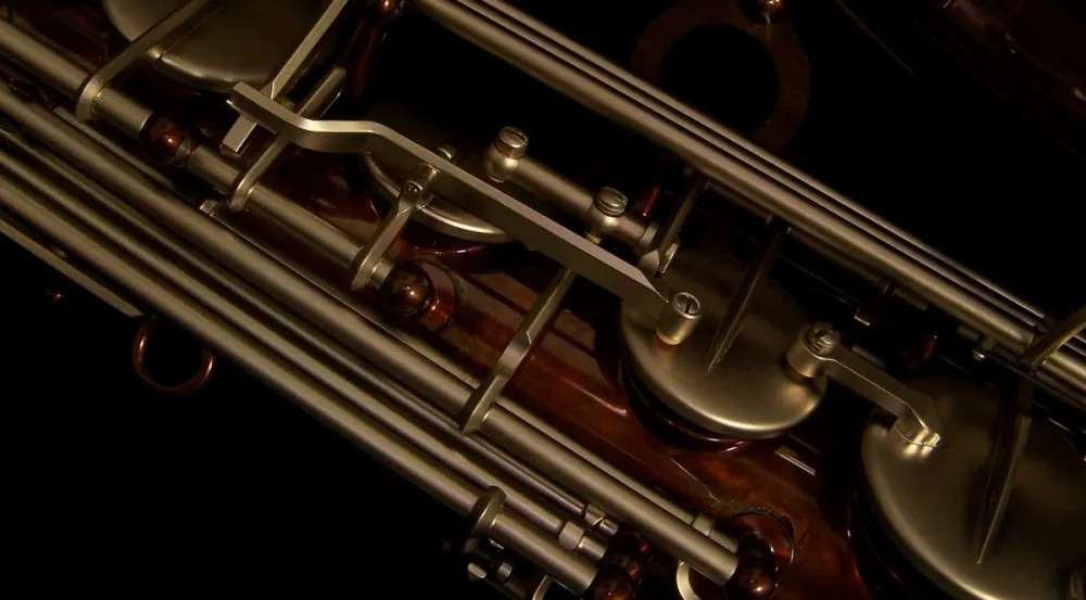 The SX90R Shadow saxophone pushes the limits of design and performance. The body is made of German nickel silver that resonates strongly and responds quickly to the players demands. Black nickel plating coats the body adding depth to the well centered and powerful sound. The inner bell and key work are silver plated to highlight the extensive hand engraving for a vibrant and dazzling appearance. From the small, intimate club to a concert arena for thousands of fans, the SX90R Shadow saxophone lets the player take control and offers limitless potential for expression and sound.