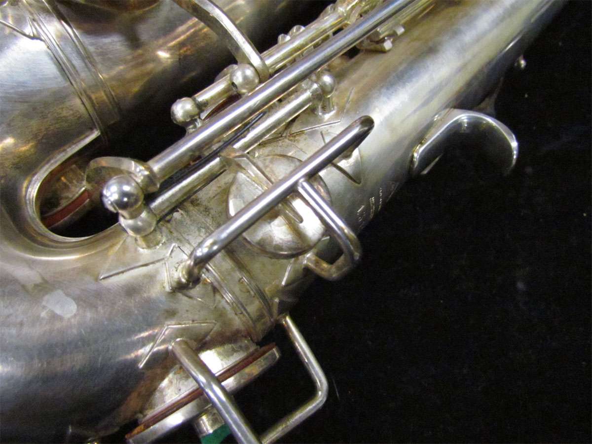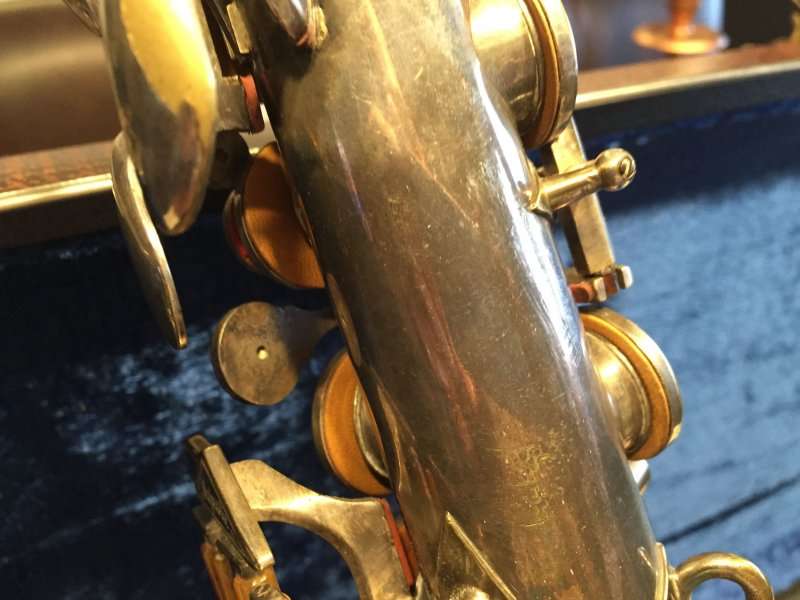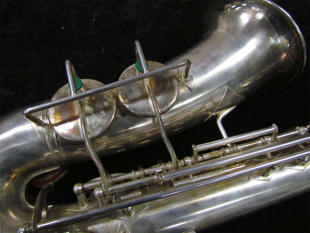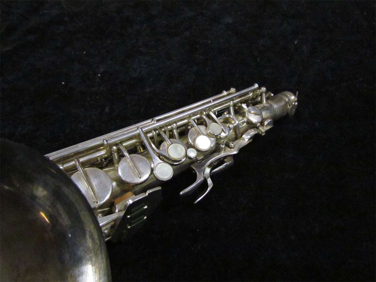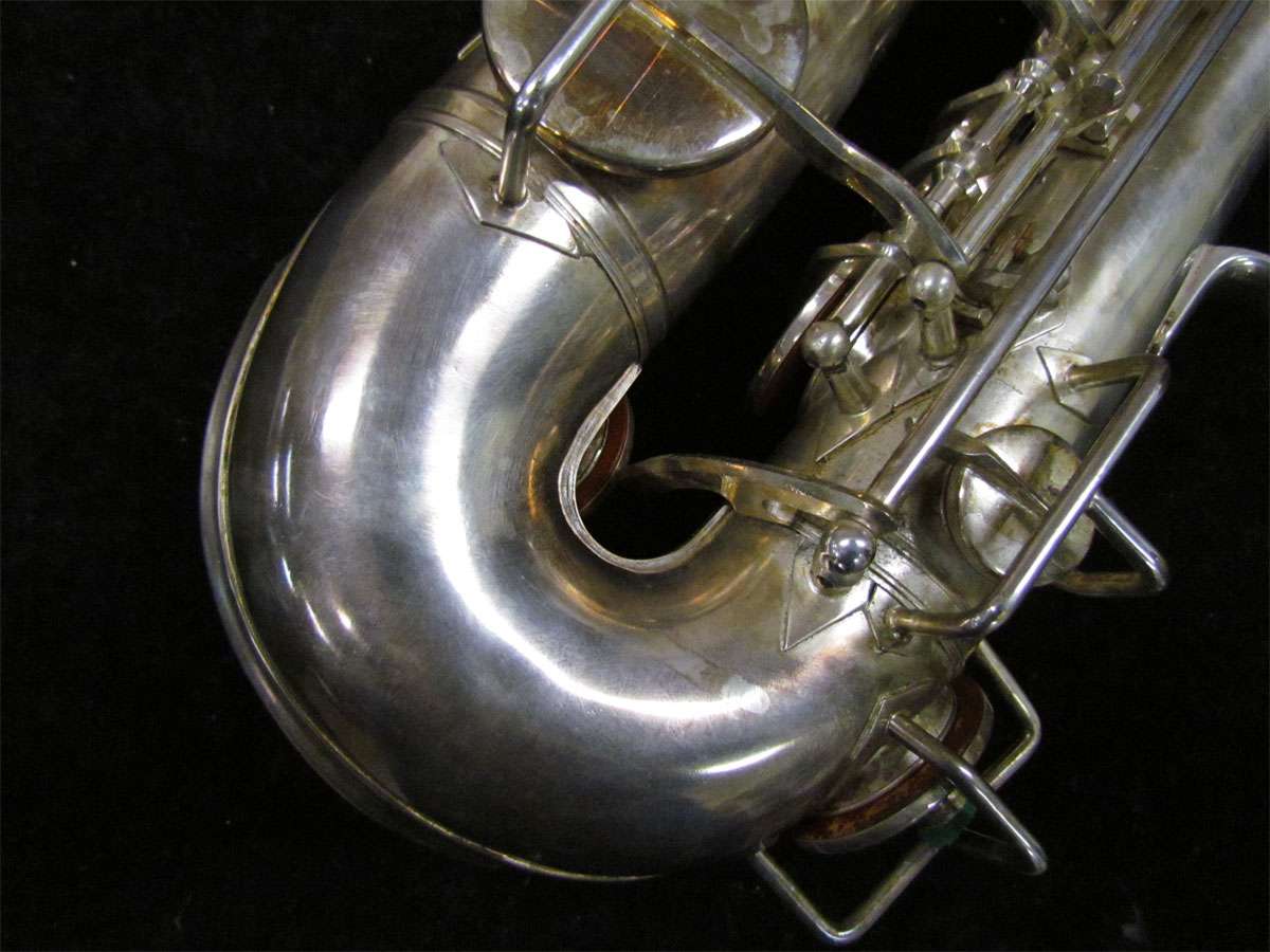 The original silver plated body of the saxophone is in pristine physical condition. It shows no signs of ever receiving any major cosmetic damage in the past. The bell flare, bow and body tube are all in outstanding shape. It also includes the original neck in very good condition. The neck has never been pulled down or bent in the past. The pads on the saxophone appear to all be the original leather pads. This instrument is in fantastic condition but it will need a full pad job before it will be ready for serious playing.