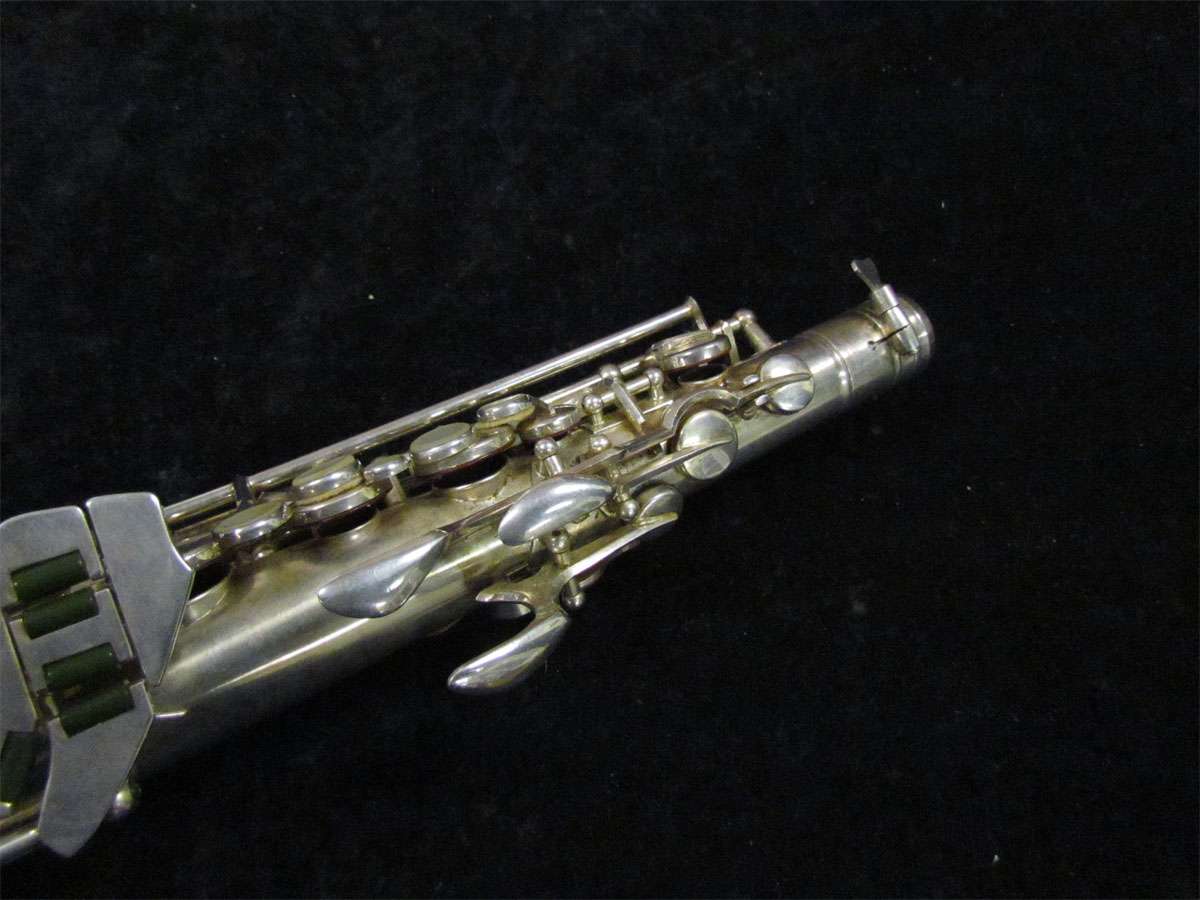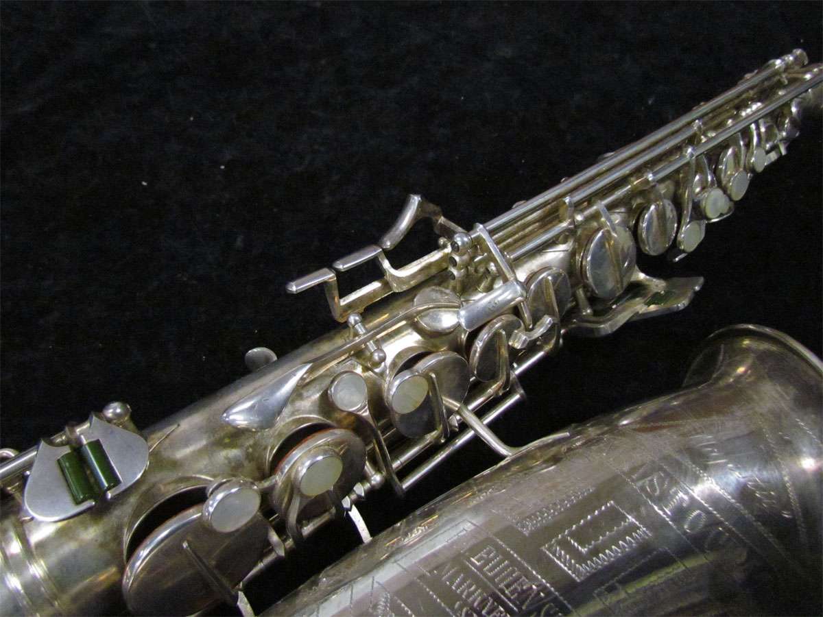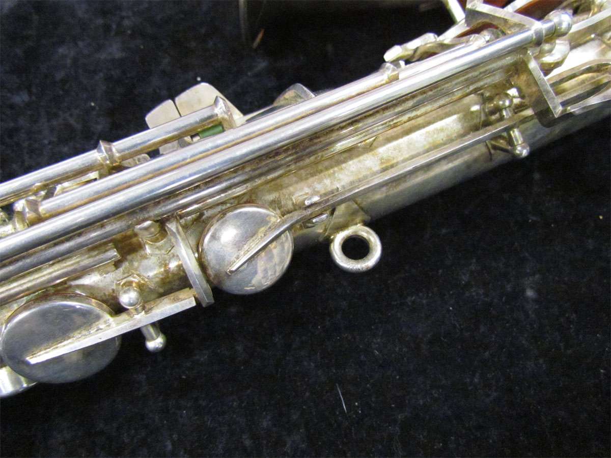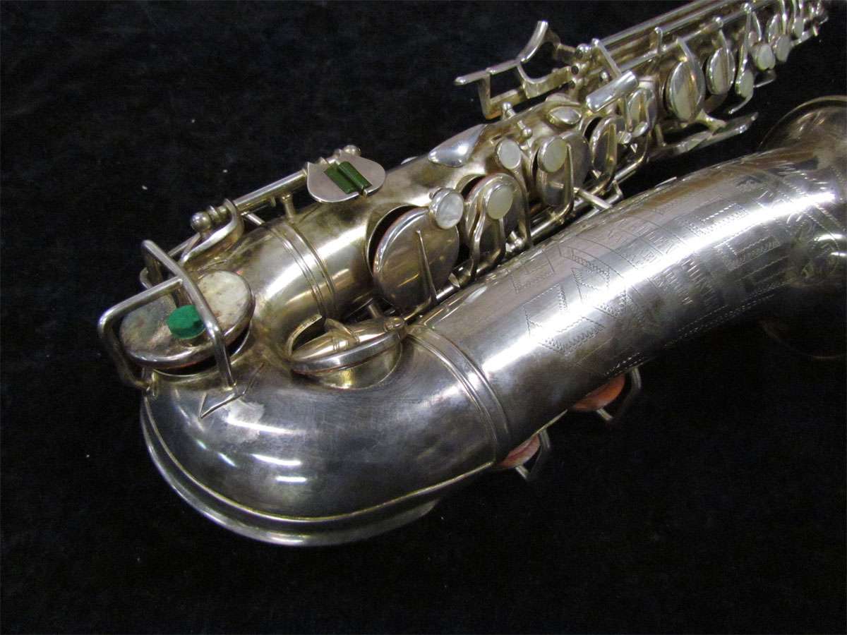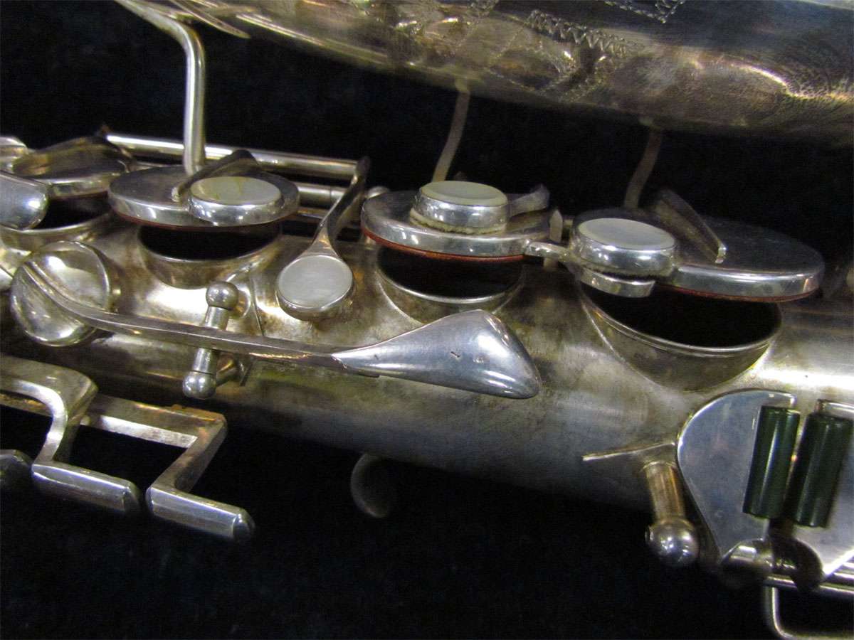 The original silver plated body of the saxophone is in pristine physical condition. It shows no signs of ever receiving any major cosmetic damage in the past. The bell flare, bow and body tube are all in outstanding shape. It also includes the original neck in very good condition. The neck has never been pulled down or bent in the past. The pads on the saxophone appear to all be the original leather pads. This instrument is in fantastic condition but it will need a full pad job before it will be ready for serious playing.