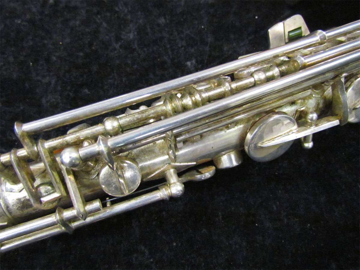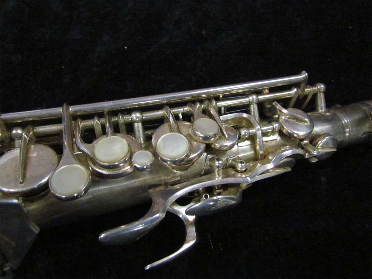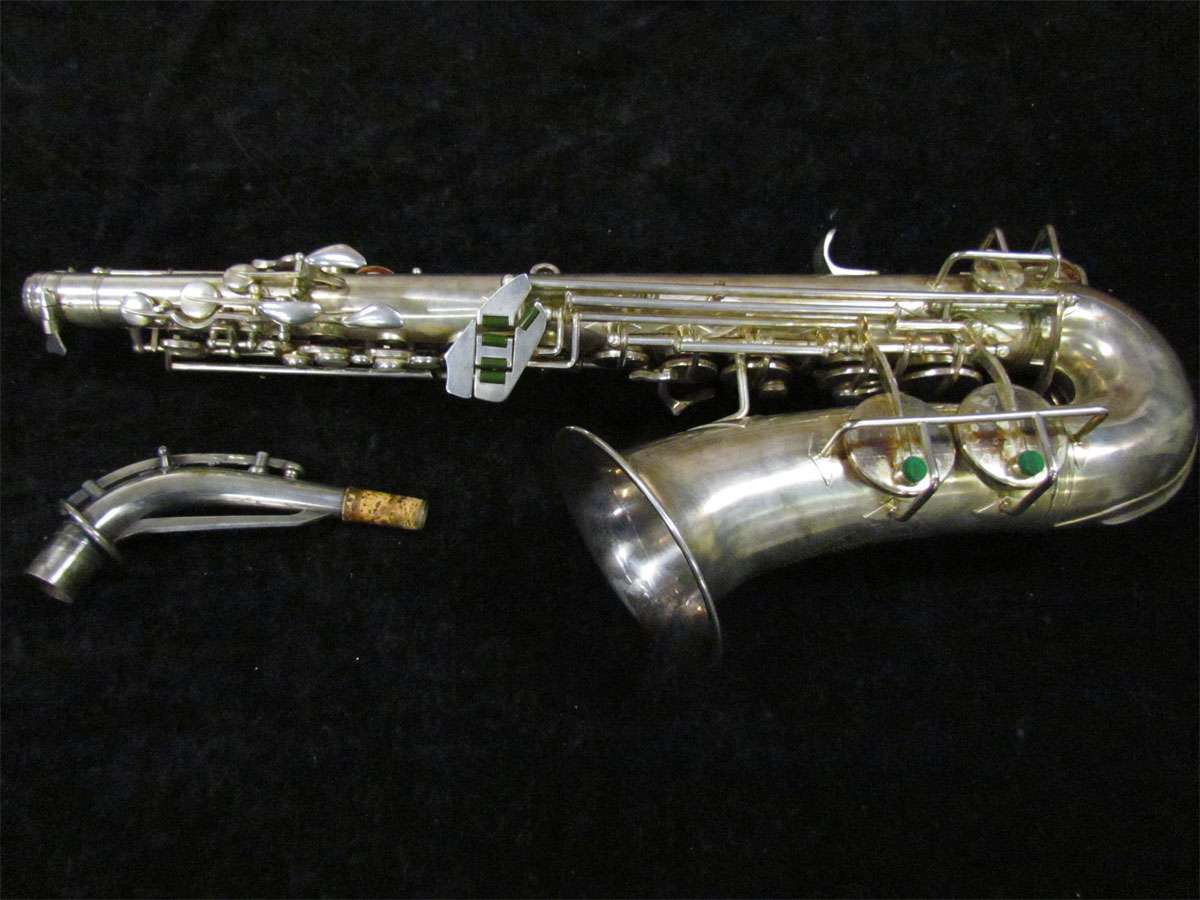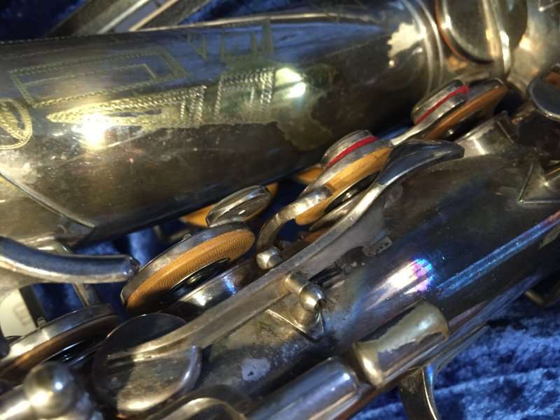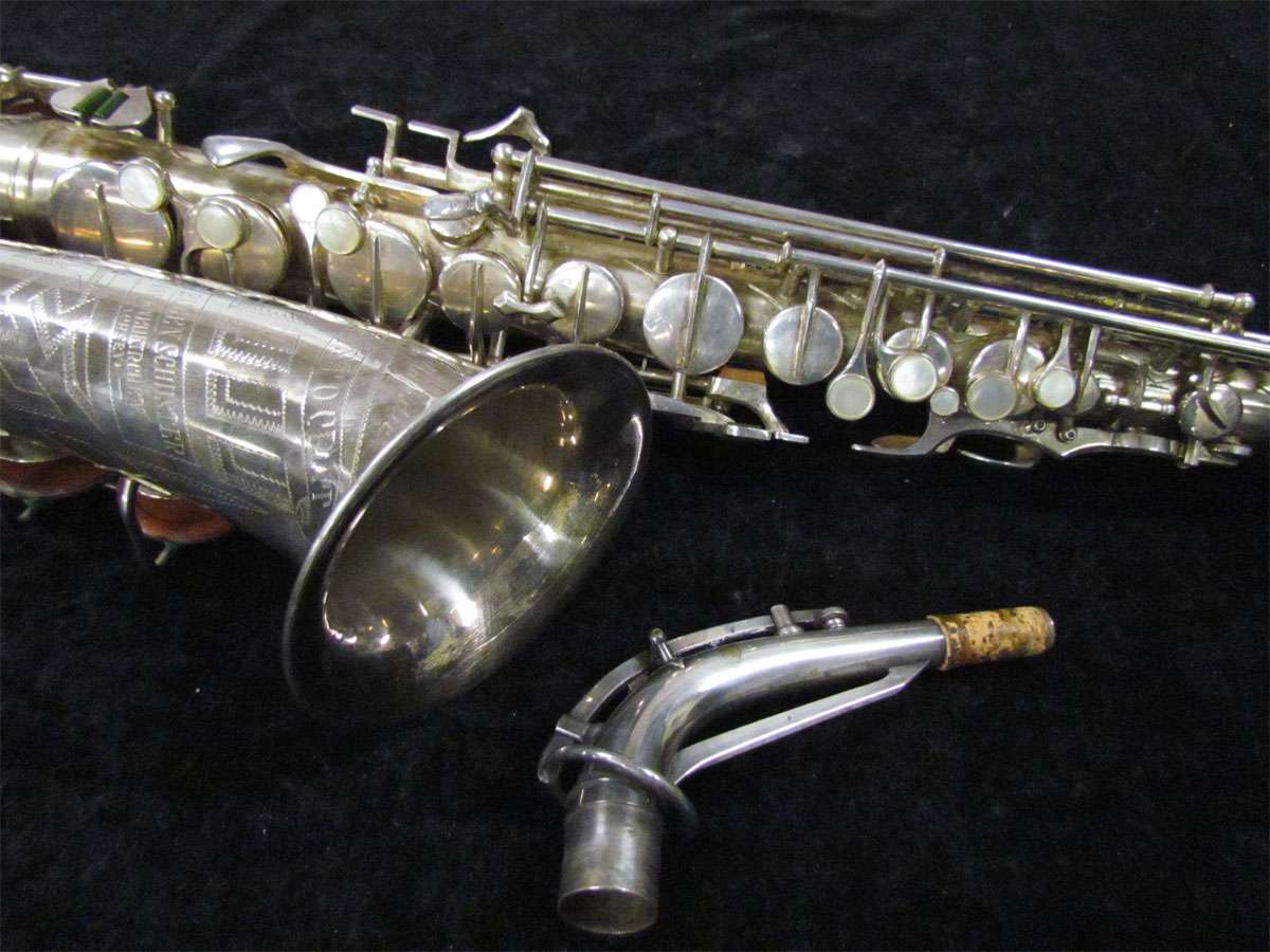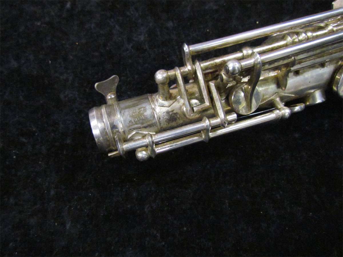 The original silver plated body of the saxophone is in pristine physical condition. It shows no signs of ever receiving any major cosmetic damage in the past. The bell flare, bow and body tube are all in outstanding shape. It also includes the original neck in very good condition. The neck has never been pulled down or bent in the past. The pads on the saxophone appear to all be the original leather pads. This instrument is in fantastic condition but it will need a full pad job before it will be ready for serious playing.