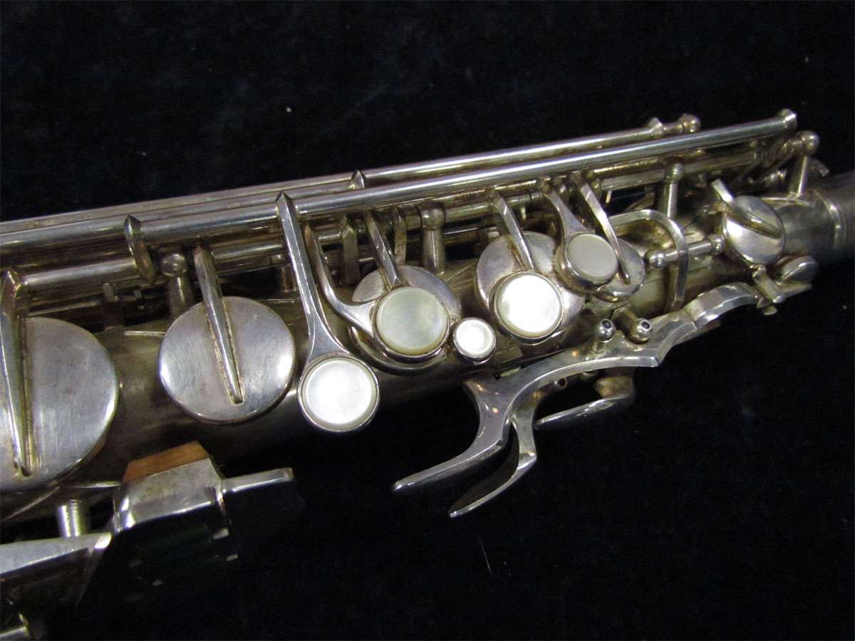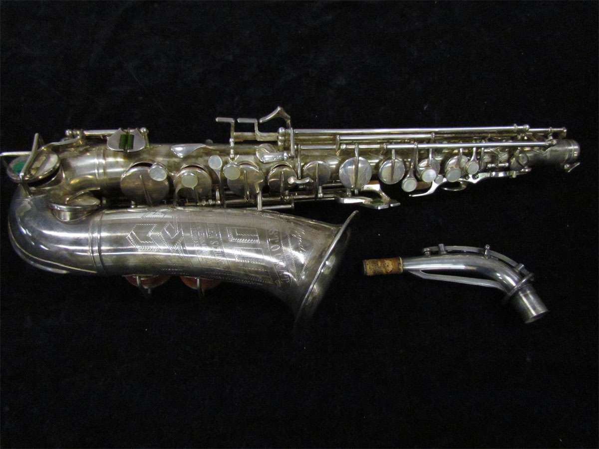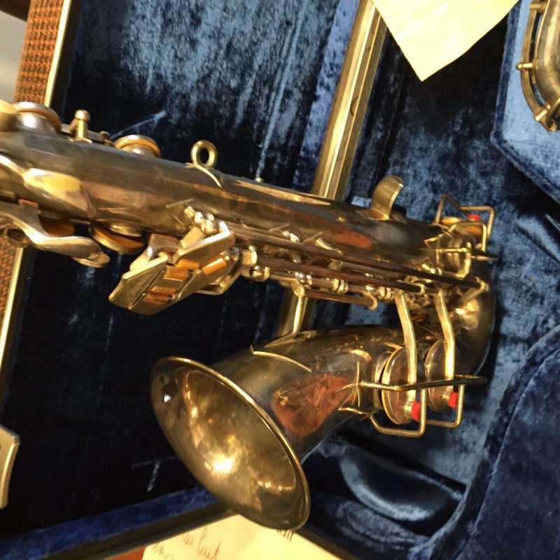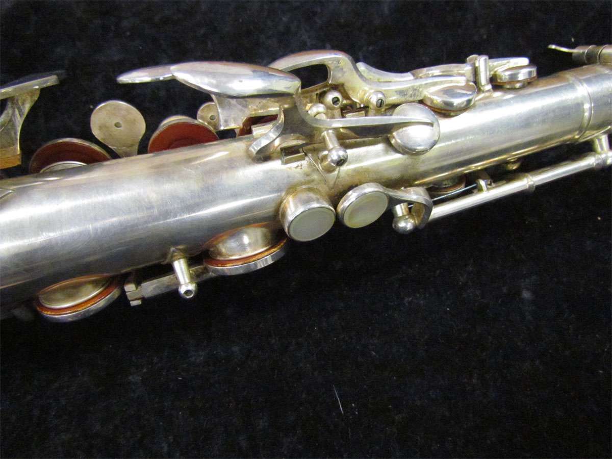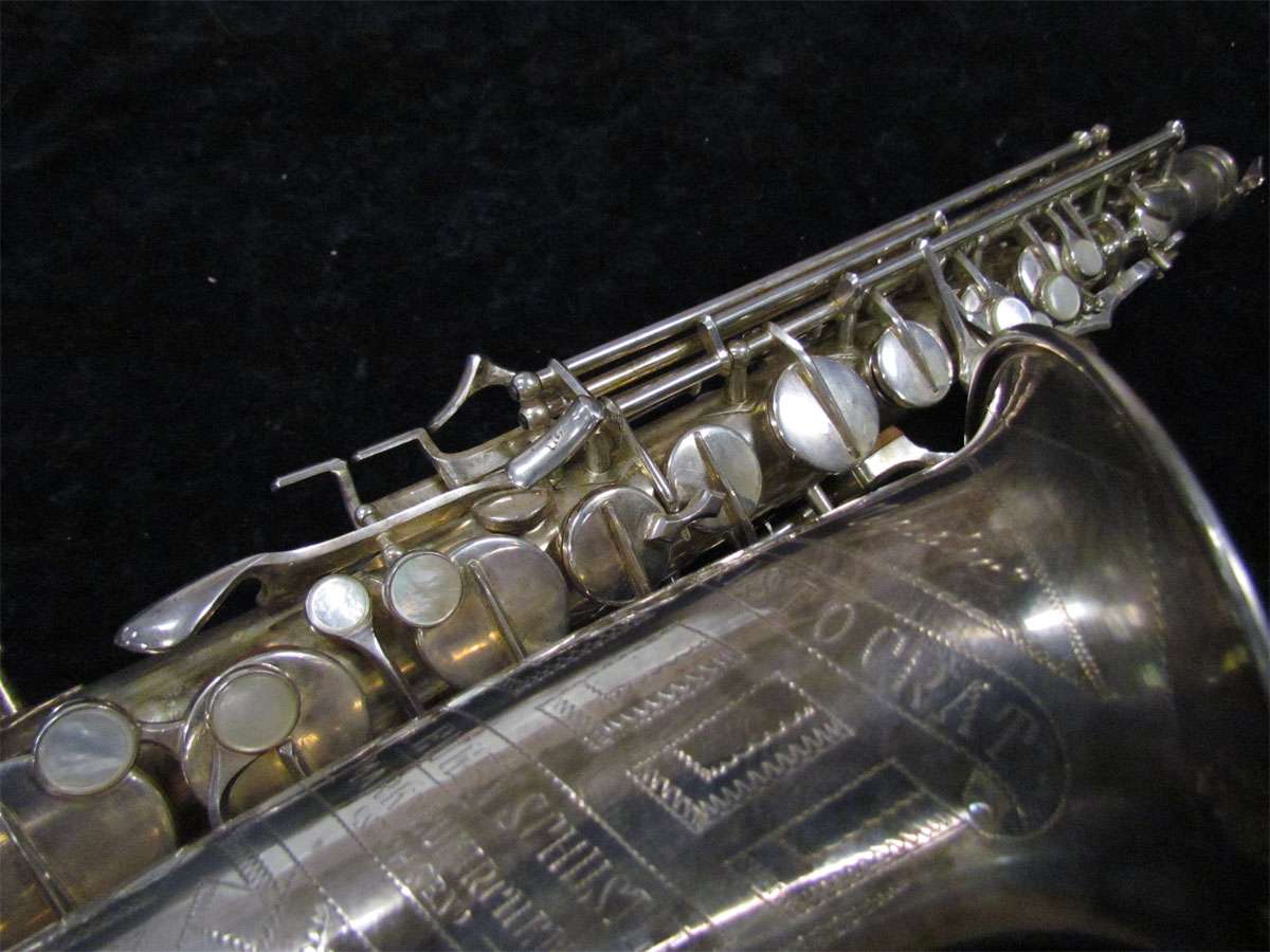 The original silver plated body of the saxophone is in pristine physical condition. It shows no signs of ever receiving any major cosmetic damage in the past. The bell flare, bow and body tube are all in outstanding shape. It also includes the original neck in very good condition. The neck has never been pulled down or bent in the past. The pads on the saxophone appear to all be the original leather pads. This instrument is in fantastic condition but it will need a full pad job before it will be ready for serious playing.
