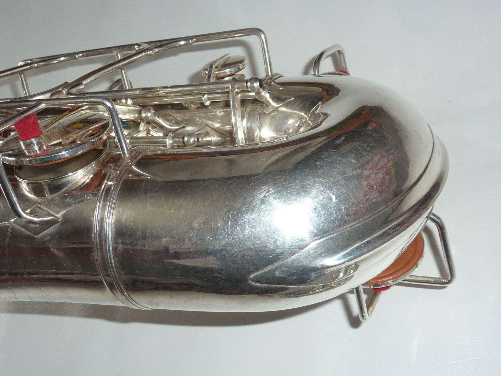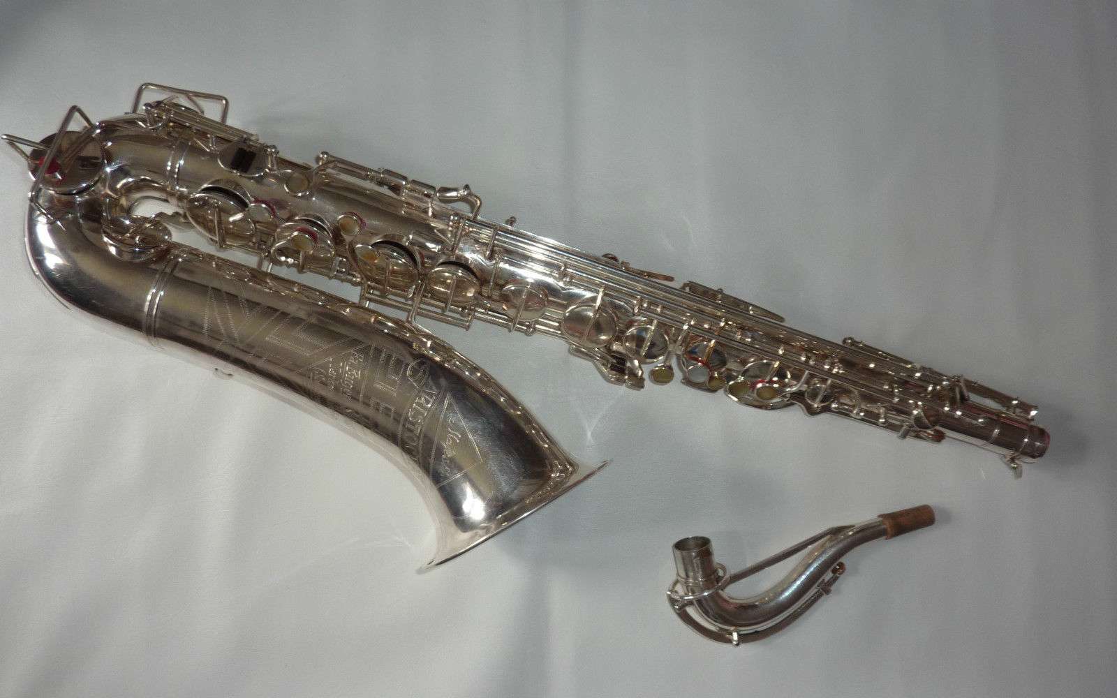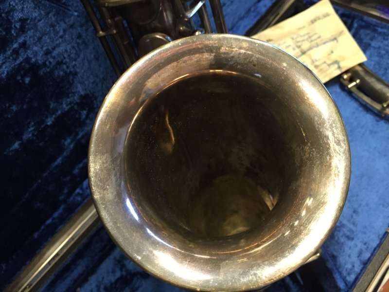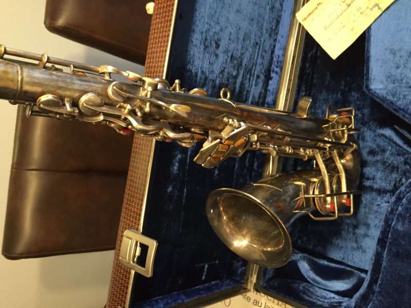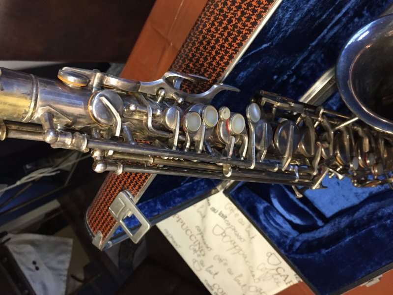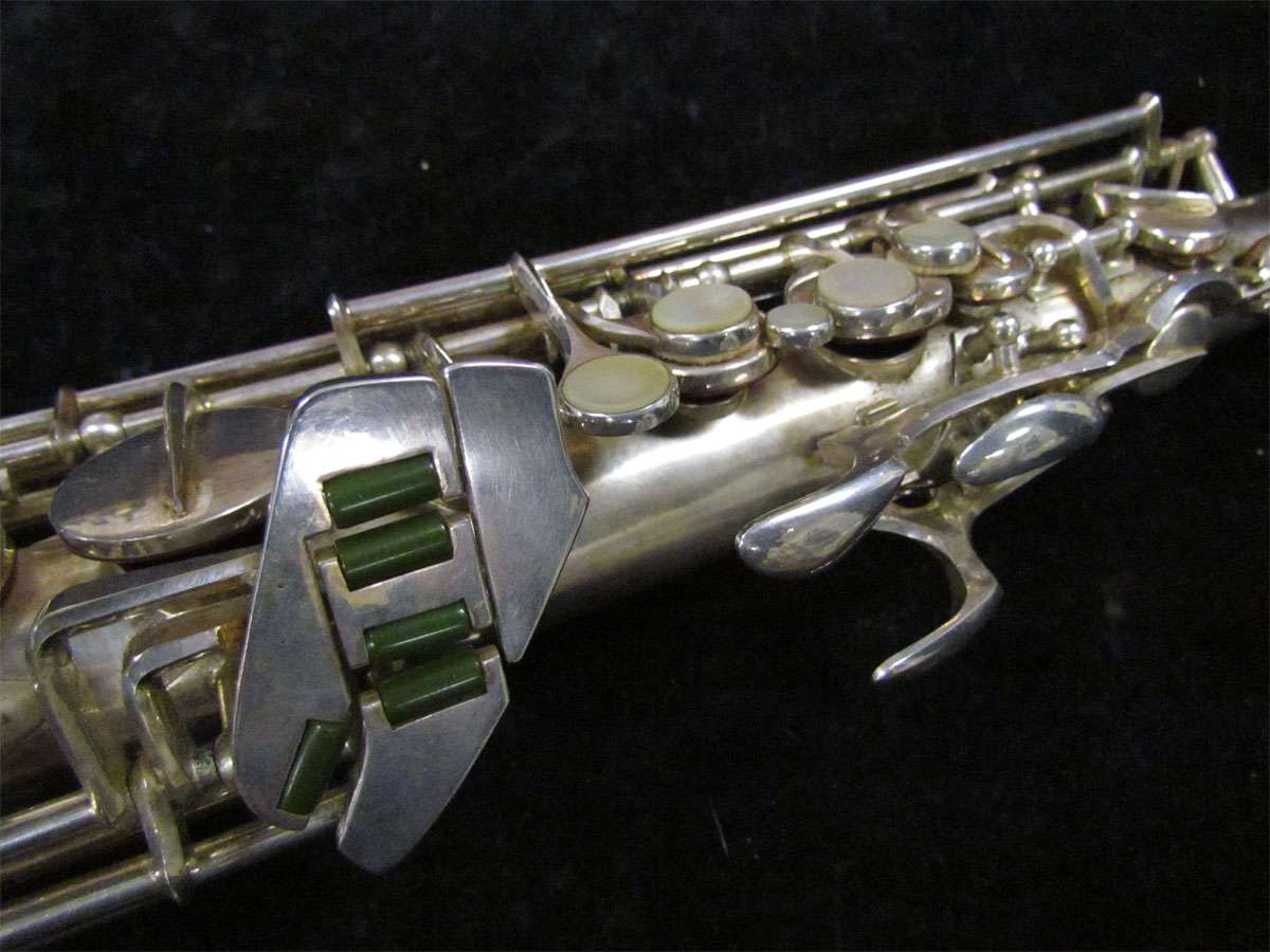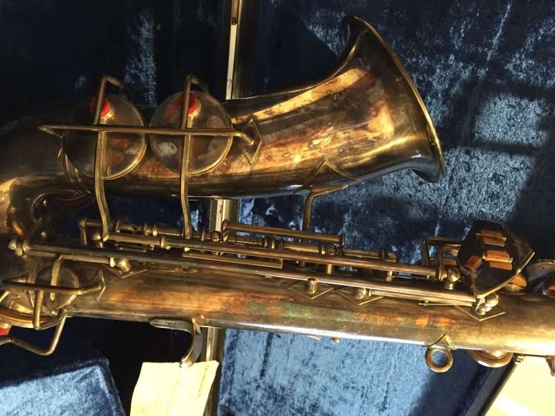 The original silver plated body of the saxophone is in pristine physical condition. It shows no signs of ever receiving any major cosmetic damage in the past. The bell flare, bow and body tube are all in outstanding shape. It also includes the original neck in very good condition. The neck has never been pulled down or bent in the past. The pads on the saxophone appear to all be the original leather pads. This instrument is in fantastic condition but it will need a full pad job before it will be ready for serious playing.