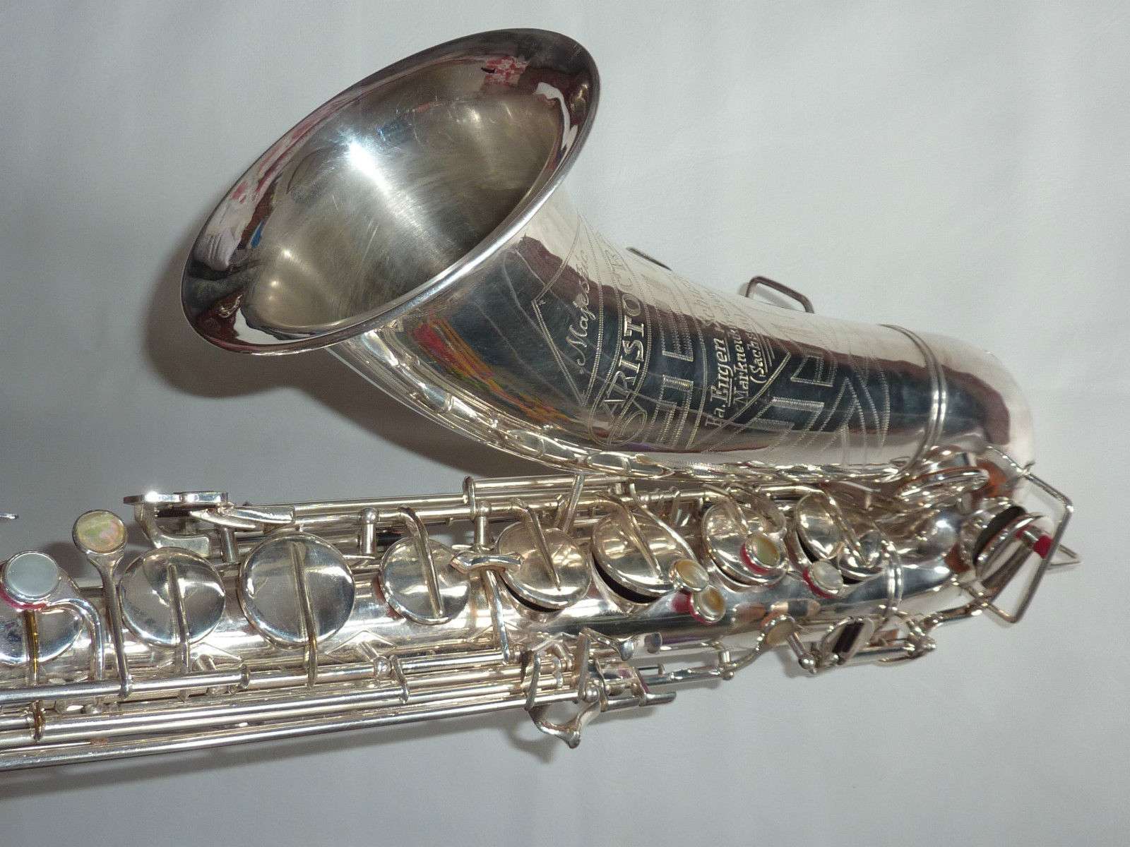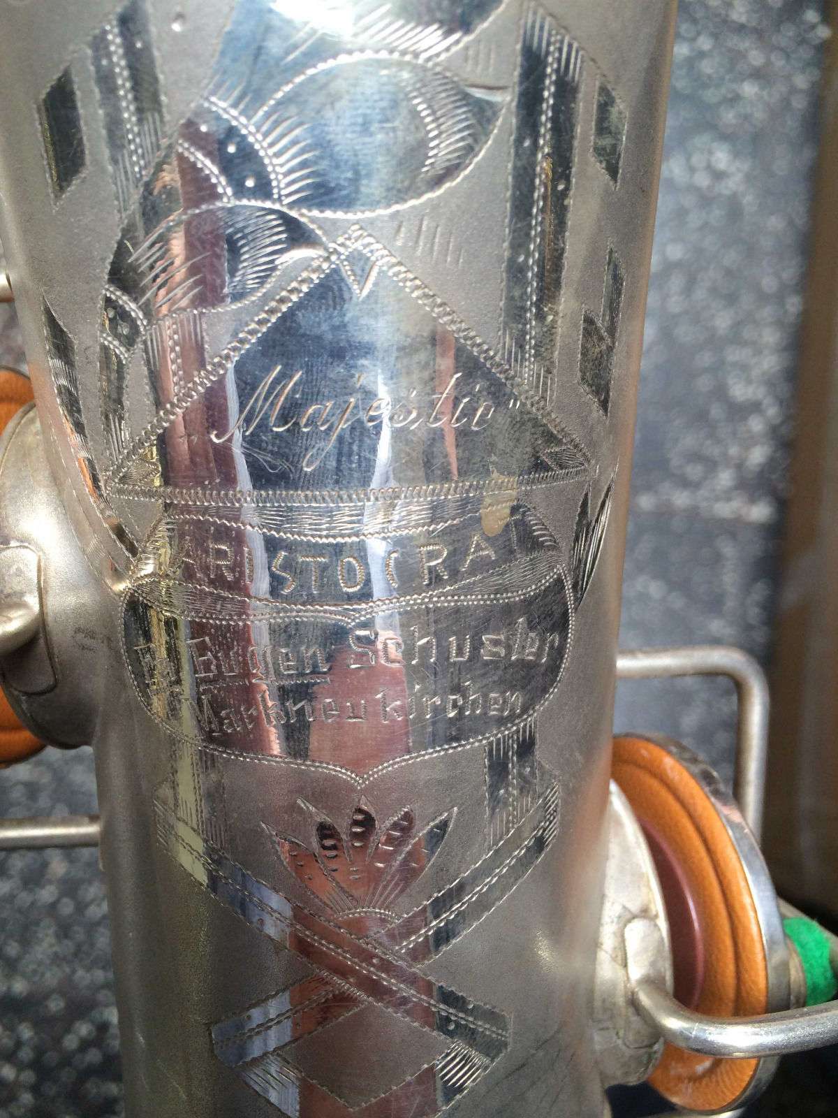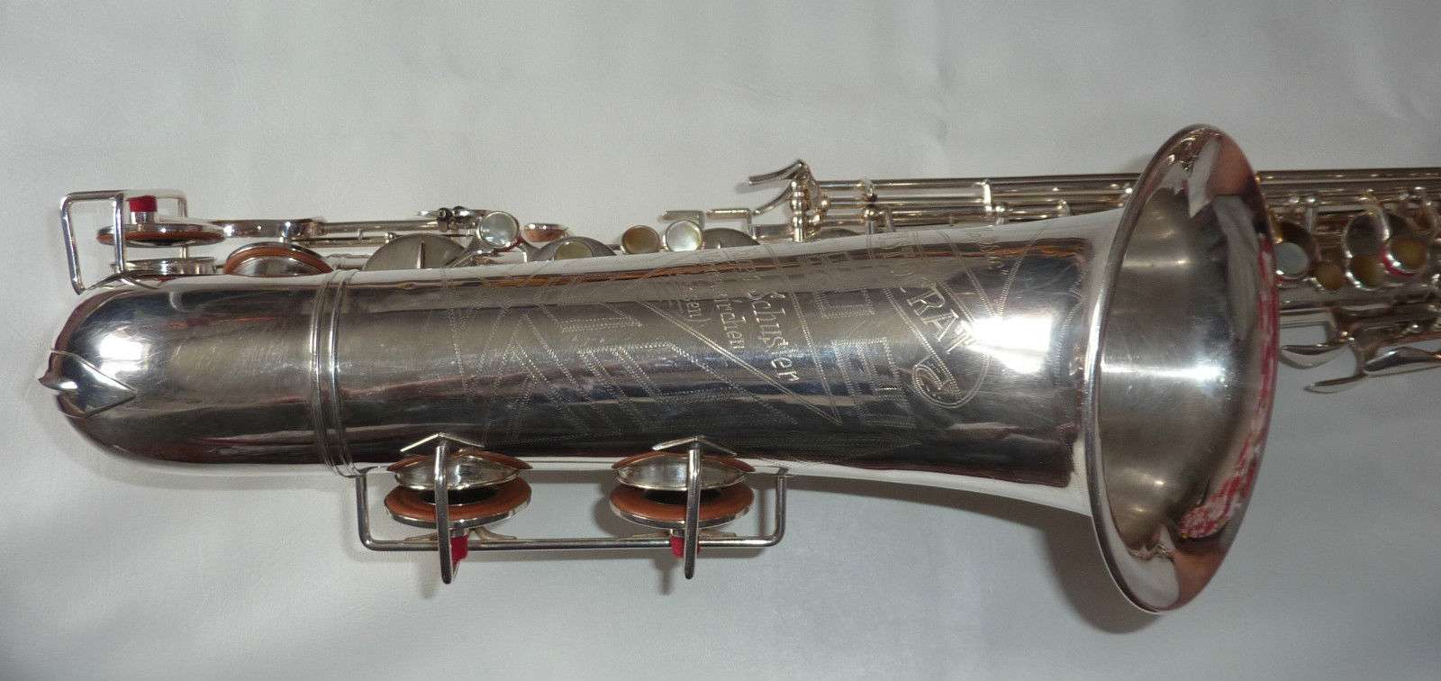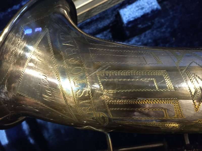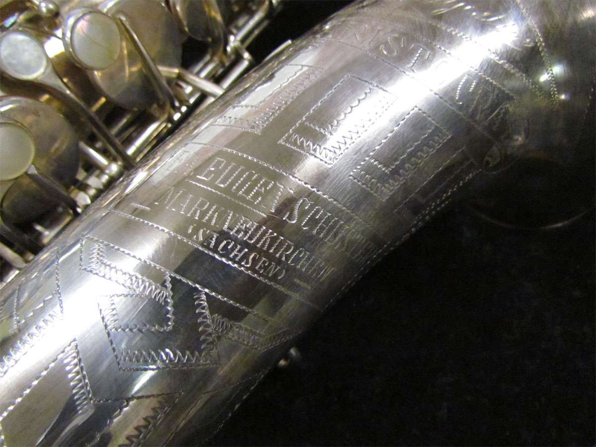 Eugen Schuster, saxophone bell engraving, silver saxophone,