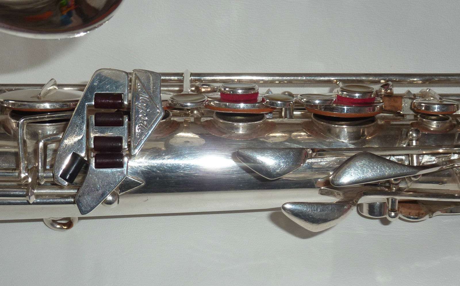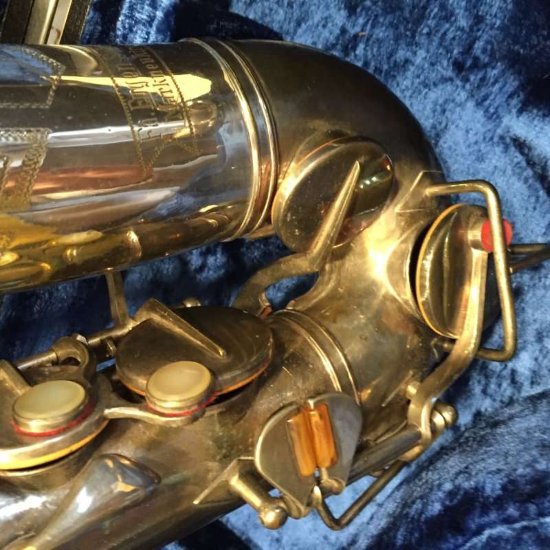 This is a very interesting saxophone and shares many similarities to American vintage horns of the same period like Buescher and C.G. Conn. The construction features a Conn like table key cluster, trill G#, left side bell keys, rolled tone holes, green key rollers and a very cool trill Eb.