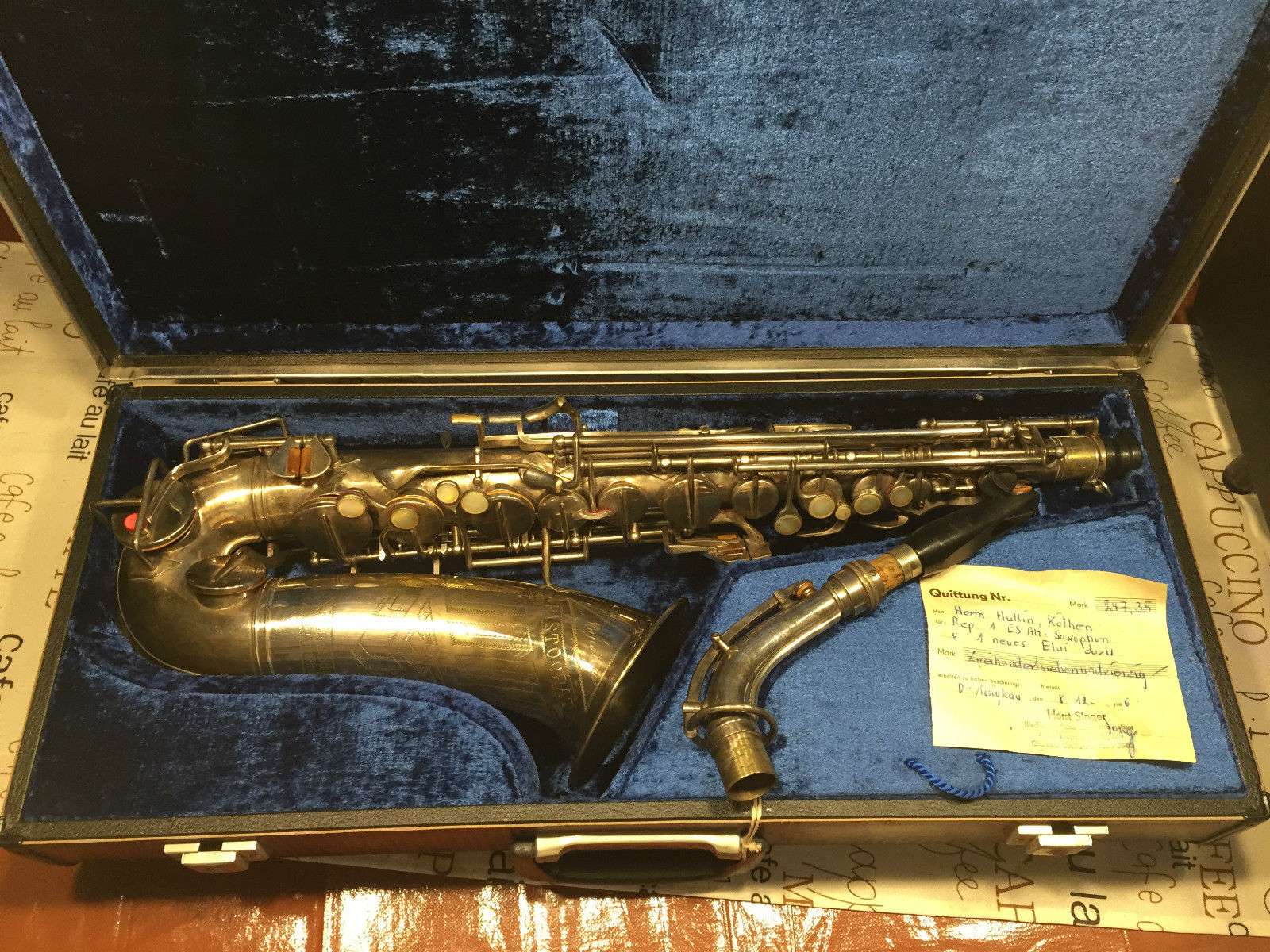 This is a very rare 1940’s vintage “Majestic” Aristocrat F.A. Eugen Schuster alto saxophone, serial number 1316. The saxophone includes the original 1945 dated purchase receipt from Leipzig Germany. It was most likely manufactured by Couf or Keilwerth {wrong} for F.A. Eugen Schuster, Markneukirchen (Sachsen). The receipt also indicates it was authorized by Frank Reynolds whom later went on to work for the Olds and Sons Company.