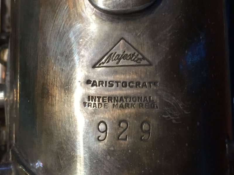 The names MAJESTIC PROFESSIONAL/MODEL 1930 as well as MAJESTIC [in a triangle shape]/ ARISTOCRAT / INTERNATIONAL / TRADE MARK REG / [with serial no.] can be found under the thumb rests of his instruments.